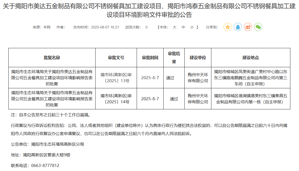 2025年8月7日,揭陽(yáng)市生態(tài)環(huán)境局高新區(qū)分局就2個(gè)不銹鋼餐具加工建設(shè)項(xiàng)目環(huán)境影響報(bào)告表作出審批通過(guò)并對(duì)外進(jìn)行公告,公告期:自本公告發(fā)布之日起三十個(gè)工作日屆滿。