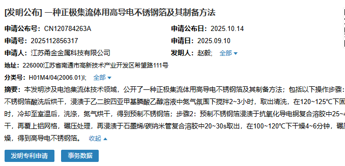 2025年10月14日,江蘇甬金金屬科技有限公司成功申請(qǐng)一項(xiàng)名為“一種正極集流體用高導(dǎo)電不銹鋼箔及其制備方法”專(zhuān)利,申請(qǐng)公布號(hào)為CN120784263A,申請(qǐng)日期為2025年9月10日。