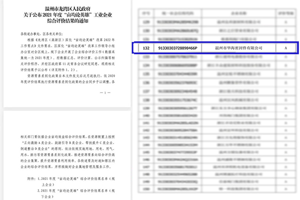 近日,溫州市龍灣區(qū)人民政府公布2021年龍灣區(qū)(高新區(qū))“畝產(chǎn)論英雄”工業(yè)企業(yè)綜合評價結(jié)果,溫州市華海密封件有限公司被評為A類企業(yè)。