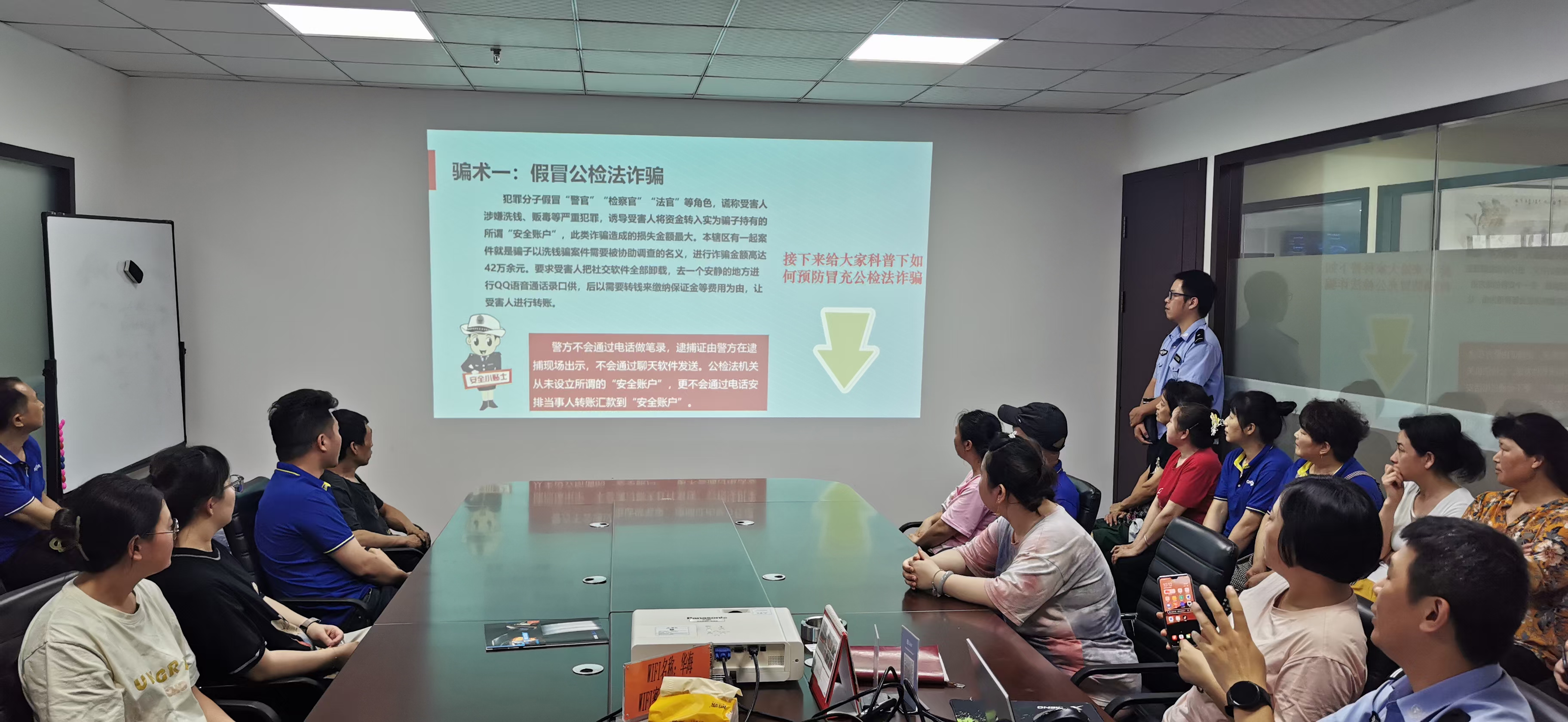 警官為大家詳細(xì)講述介紹了各式各樣的詐騙方式,教會我們?nèi)绾握_辨別騙子的詐騙手段,保護(hù)好公司及個人自身的利益,全體人員受益匪淺,在此對永興派出所警官的細(xì)心講解表示感謝!